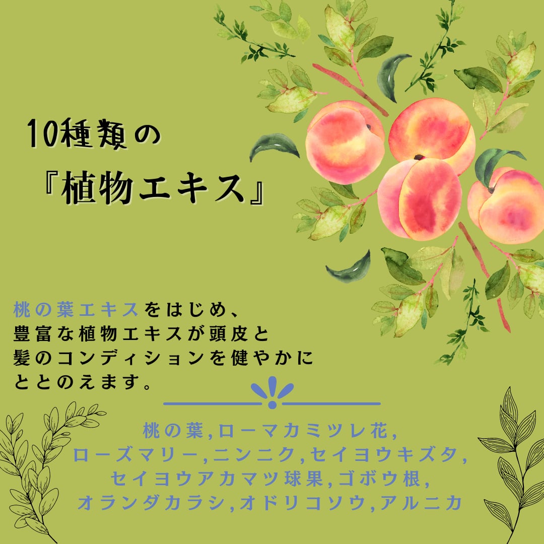 モモ葉エキスをはじめとする10種の植物エキスが、ドッグの髪にしっかりとしたうるおいを与えてくれます。