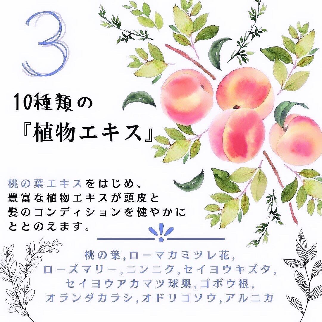 さらに、モモ葉エキスをはじめとする10種の植物エキスが配合されており、うるおいを与えるだけでなく、細かな泡で泡立ちも良く、泡切れも良いため、髪や地肌を優しく洗い上げることができます。